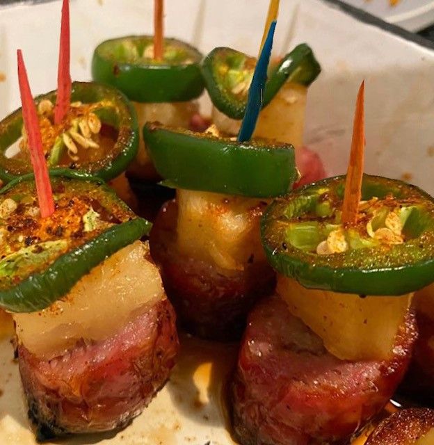 Appetizers - bacon-wrapped jalapeno poppers and BBQ meatballs